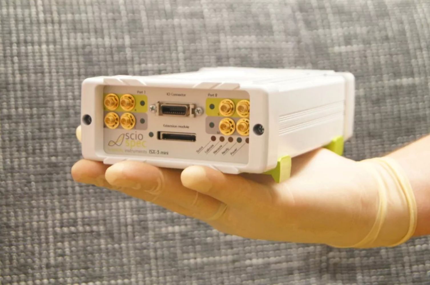 Sciospec ISX-3 Mini Impedance Analyzer Demanding measurements but no room for large and bulky lab equipment? Impedance Spectroscopy out in the field? With the ISX-3 Mini Impedance Analyzer, Sciospec offers a fully equipped impedance analyzer fitting in the palm of your hand. In standard configuration the ISX-3mini is equipped with Sciospec’s IF frontend. Within the measurement range from 100 mHz to 10 MHz (extendable to 40 or 100 MHz) it covers a dynamic range of 300dB (mOhm…TOhm) with a base precision of 0.01%. The two multiplexed 4-electrode MCX measurement ports greatly simplify comparative measurements of two sensors or devices under test.